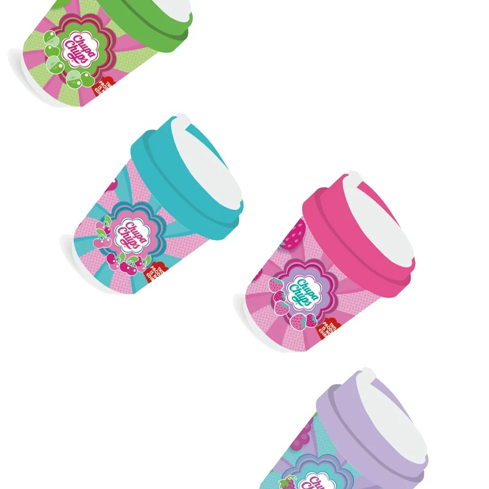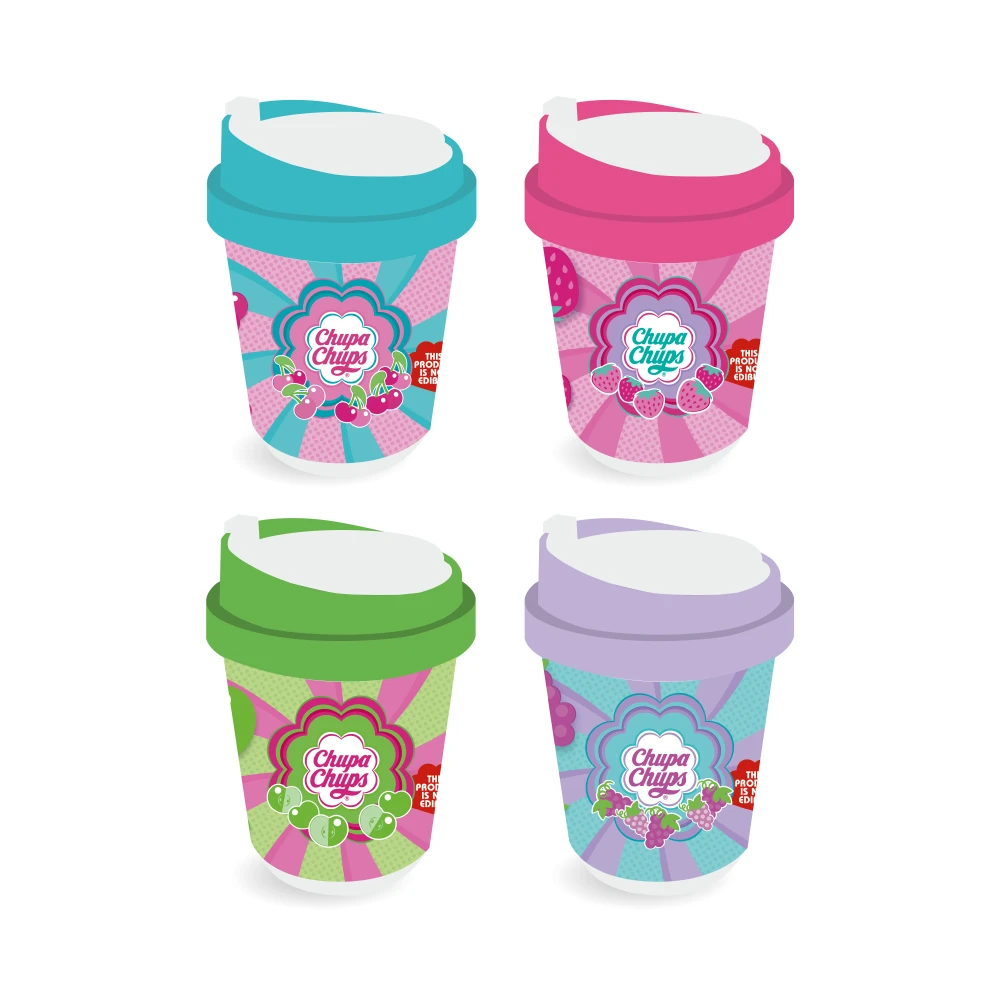 Dos 156, sharpener, Chupa Chups: a cup-inspired sharpener with bold Chupa Chups visuals. Four assorted colorways with fruit motifs (blue, pink, green, purple) deliver strong shelf appeal. Compact and fun, ideal for back-to-school ranges and impulse buys. Chupa Chups branding drives quick recognition at POS.