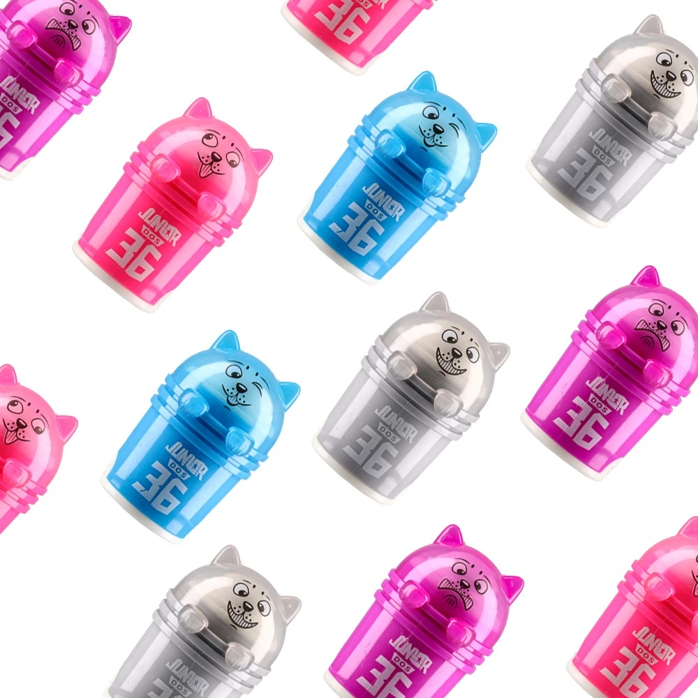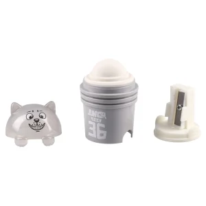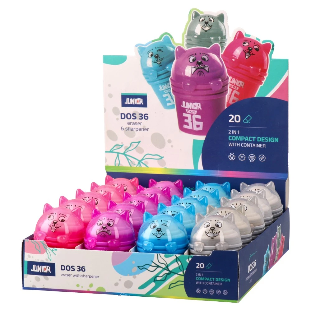 Dos 36, sharpener with eraser, dog, mix. Compact dog-shaped sharpener in glossy plastic with integrated eraser. Trendy translucent colors (pink, blue) and metallic silver finish deliver strong shelf appeal. Durable build suited for everyday use; assorted mix ideal for impulse displays.