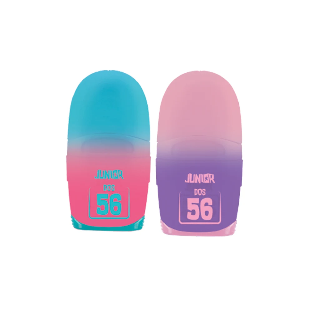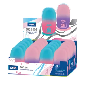 Dos 56, sharpener with eraser, mix. Compact 2-in-1 design combines a pencil sharpener and top eraser in one unit. Sturdy plastic housing with smooth, rounded form. Trendy gradient colorways enhance shelf appeal. Supplied in assorted mixes, suitable for school and office ranges.