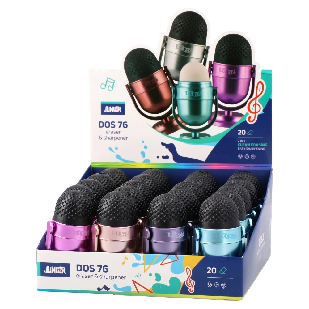 Dos 76 is a microphone-shaped pencil eraser and sharpener featuring a sleek metallic-finish shell and textured cap. Supplied in a mixed palette of purple, rose gold, pink and blue. Trend-led design, compact desk presence and sturdy build maximize shelf appeal and everyday usability.