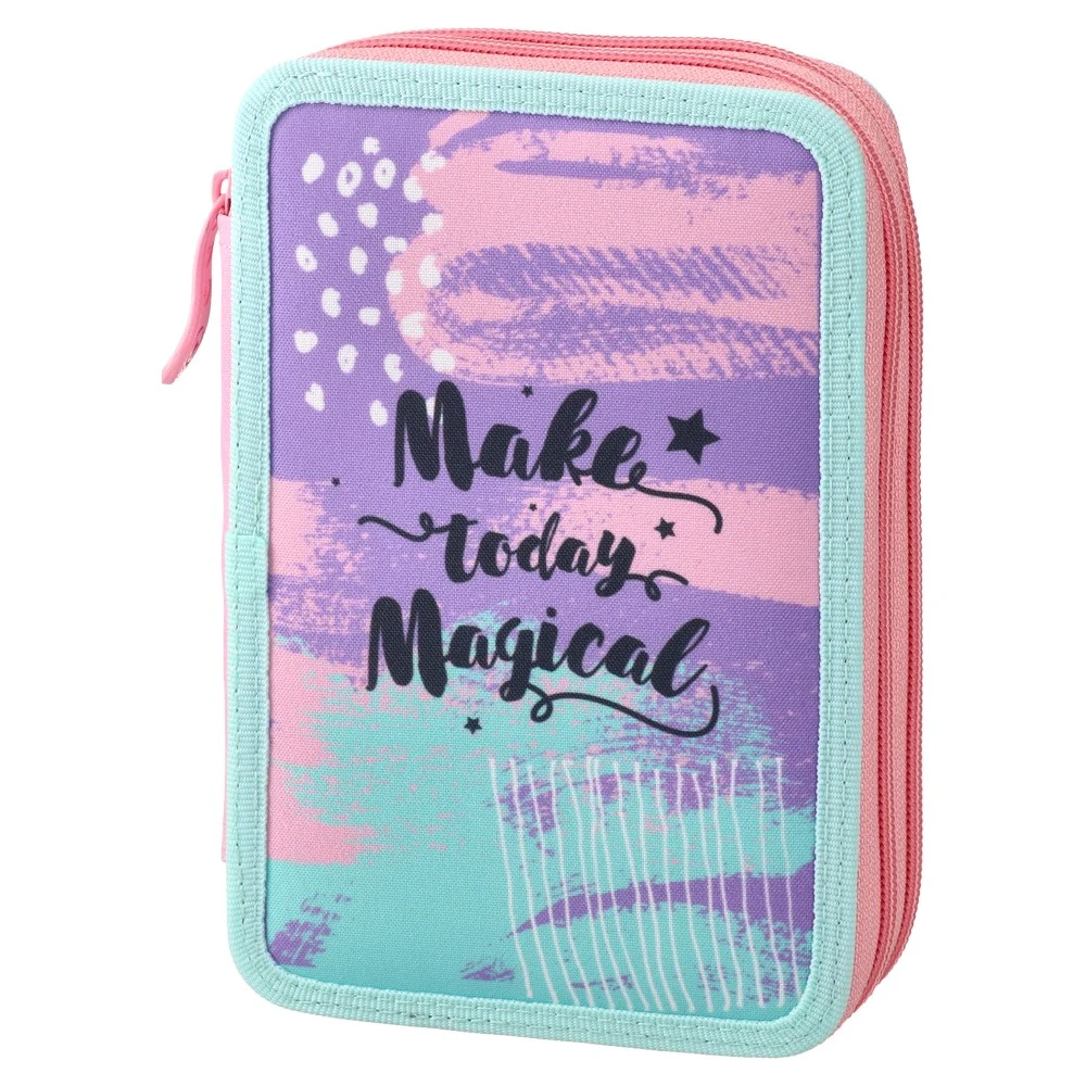 Double-decker pencil case with two zip-around compartments for efficient organization. Trendy pastel design with mint edging and a Make today Magical print boosts shelf appeal. Durable textile exterior and clean stitching deliver reliable quality for daily school use.
