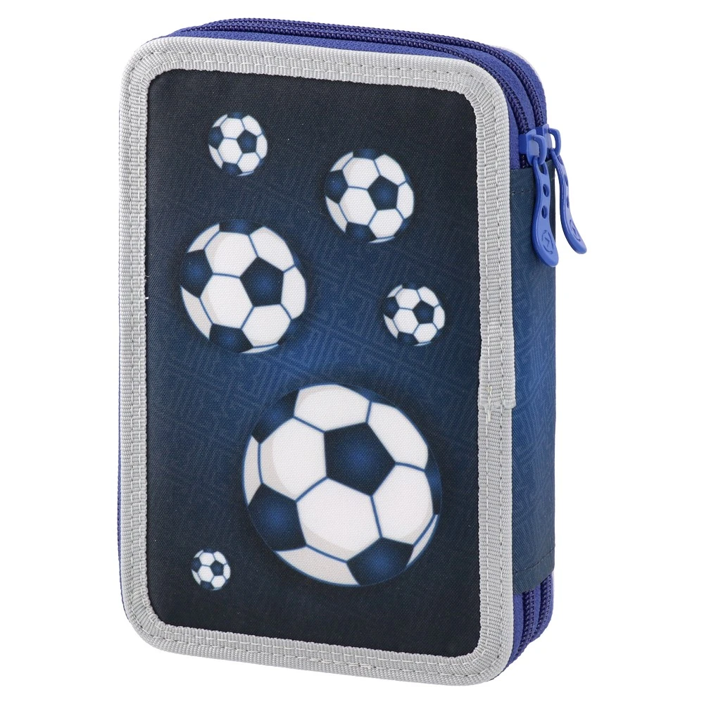 Double-decker pencil case with two zip closures. Football theme in navy, red and white with a #1 soccer ball and crest accents. Textile cover, grey bound edges, twin blue zippers. Strong shelf appeal for school ranges and sports-themed assortments.