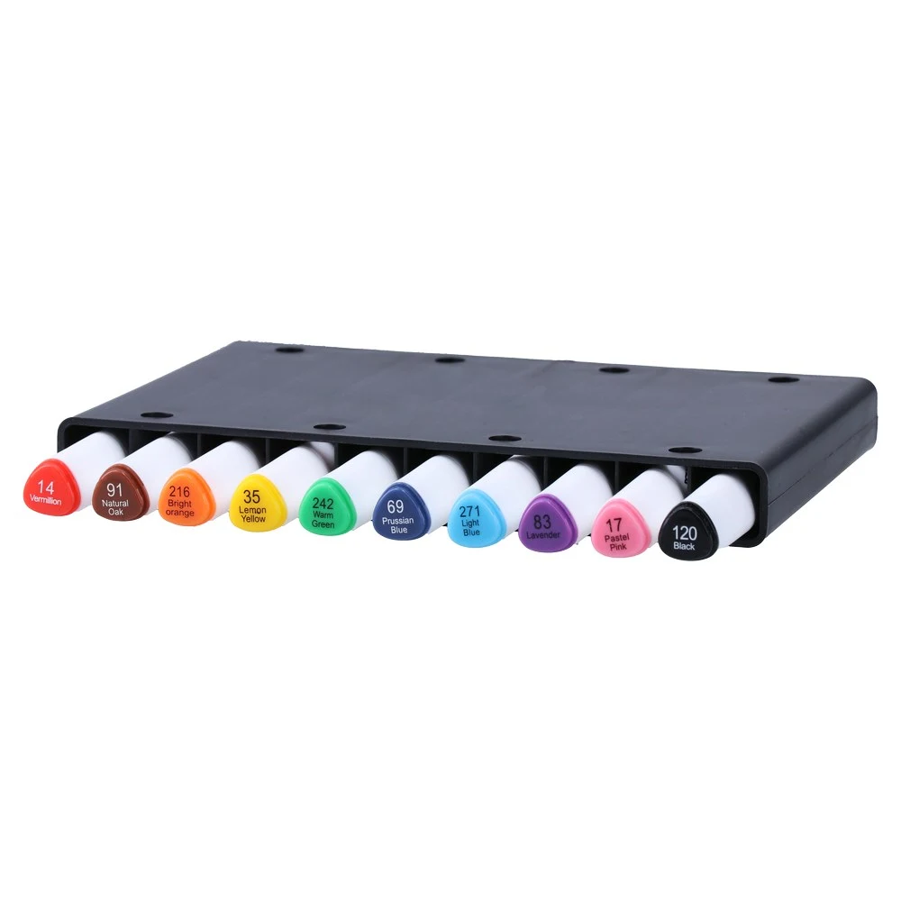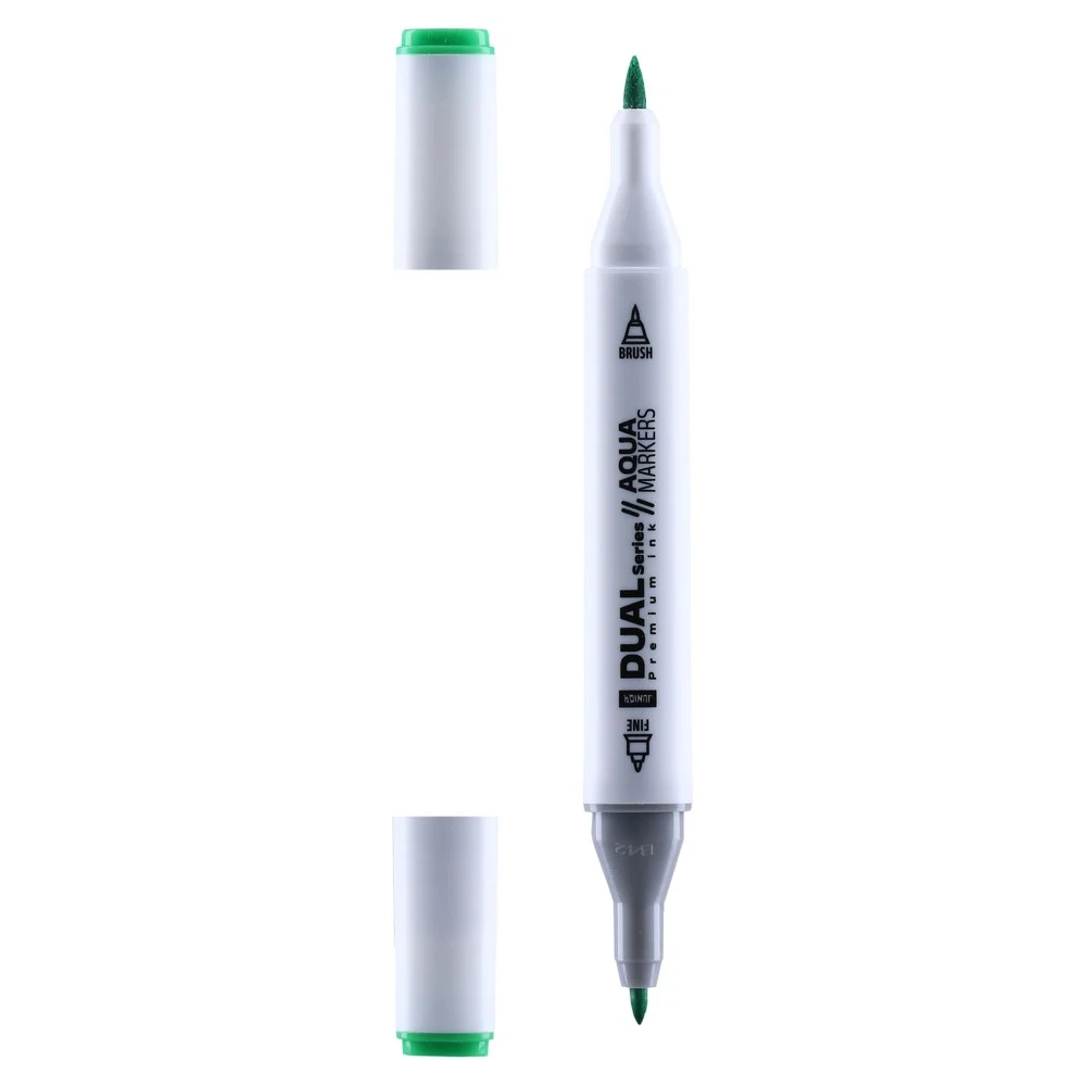 Dual 10 aqua markers with double-ended tips: fine and brush. Set of 10 mixed colors delivers vibrant tones and smooth strokes. Includes a stand for organized use and display. Modern packaging with clear tip icons enhances shelf impact for art, school, and hobby channels.