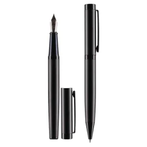 Elkano is a modern writing set pairing a matte black fountain pen and ballpoint. Clean, streamlined barrels and matching clips deliver a contemporary look. The fountain pen’s metal nib supports precise strokes. Supplied in a branded presentation box, ideal for corporate gifting.