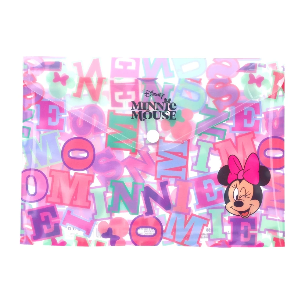 Enlo 5, envelope folder, Minnie Mouse, A5. Translucent plastic with multicolor lettering and Minnie graphic offers a trendy, eye‑catching look. Envelope flap with snap closure secures contents. Practical A5 format for organizing notes, tickets, and receipts with strong shelf appeal.