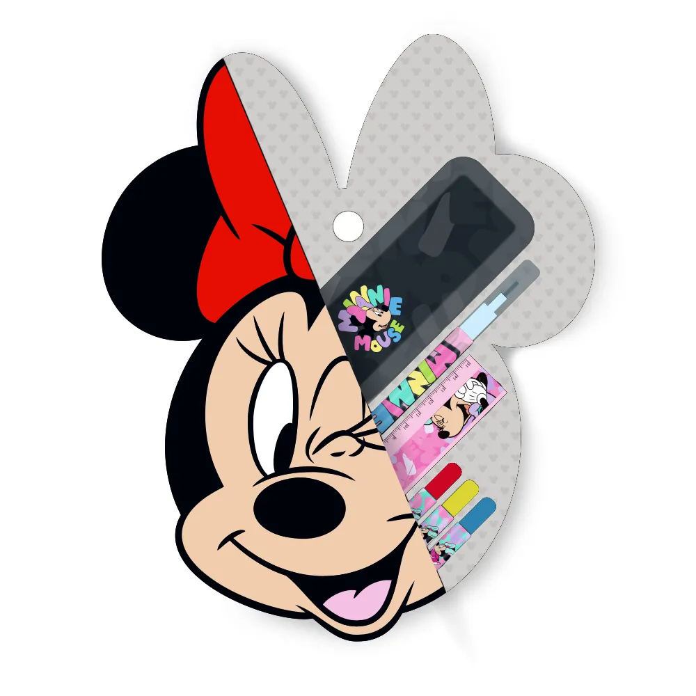 Escolar Sety 6B: vibrant 6-piece school set with Minnie Mouse artwork. Die-cut Minnie-head card with hang hole for easy display. Coordinated stationery essentials, including a ruler, show playful colors and neat finishes. Compact size supports checkout and peg displays.
