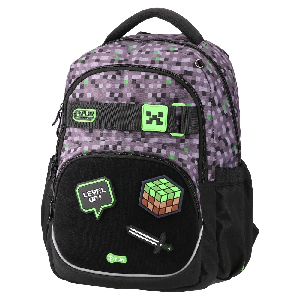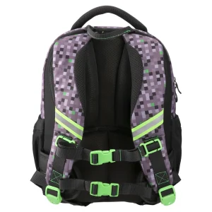 Etron, anatomic backpack, Level Up: trend-led pixel design with neon details for strong shelf impact. Robust textile body, padded top handle. Two zipped main compartments, large front pocket, side stretch pockets, and a front buckle strap. 3D game badges add standout style.