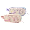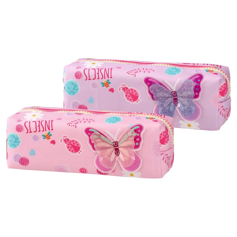 Fancy 1120, pencil case, mix. Trendy rectangular case in assorted pink and lilac colorways, featuring a glitter butterfly applique and lively kid-friendly prints. Fabric construction with a reliable zipper. Boxy form offers practical capacity and strong shelf impact for school retail.