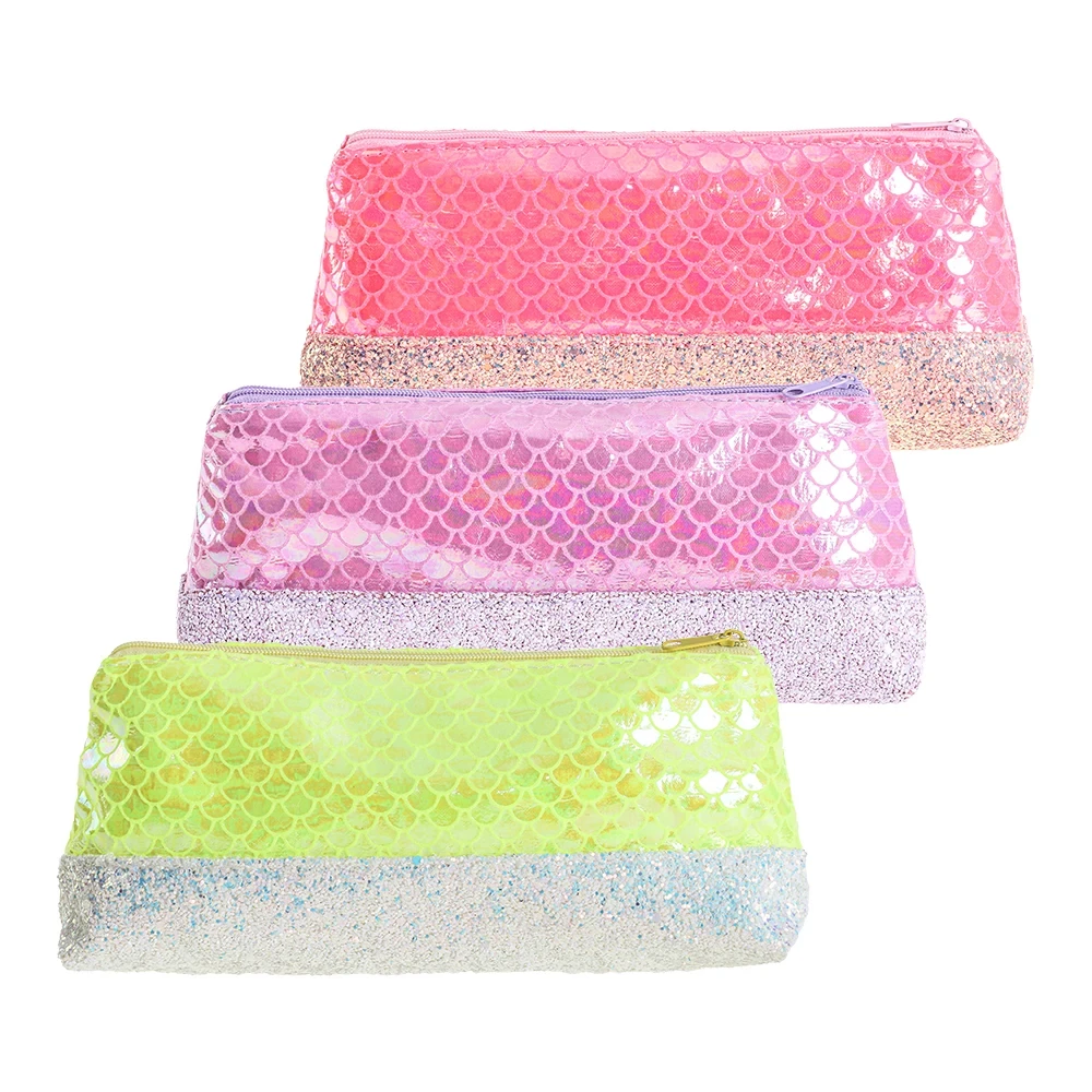Fancy 570, pencil bag, mix: zip-top case with iridescent mermaid-scale surface and a sparkling glitter bottom panel. Assorted colors including pink, lilac, and neon yellow maximize shelf impact. Trend-led look with a practical main compartment—ideal for stationery gifting and bundles.