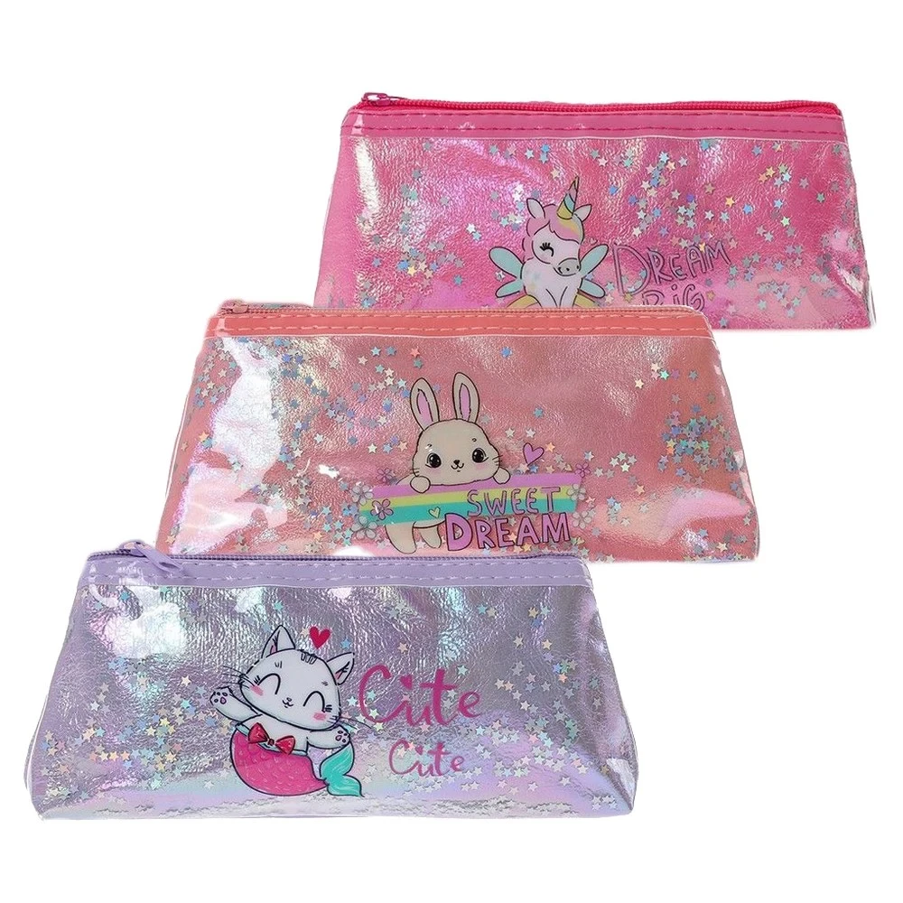 Fancy 760, pencil bag, mix. Trendy iridescent finish with star glitter and cute character prints in assorted pastel colors. Single zip compartment for pens and small accessories. Durable, eye-catching design suited for back-to-school assortments and gift displays.