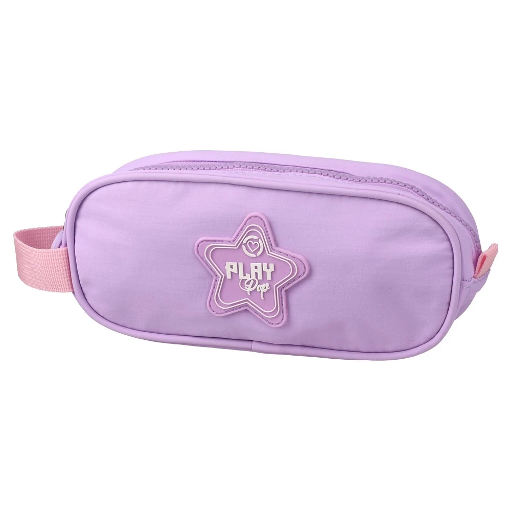 Trendy pastel purple pencil case with a sleek oval silhouette. Features a zip-top main compartment, smooth fabric exterior, and a sturdy pink webbing side handle. Front star badge adds shelf appeal. Ideal for organized storage of pens and school essentials.