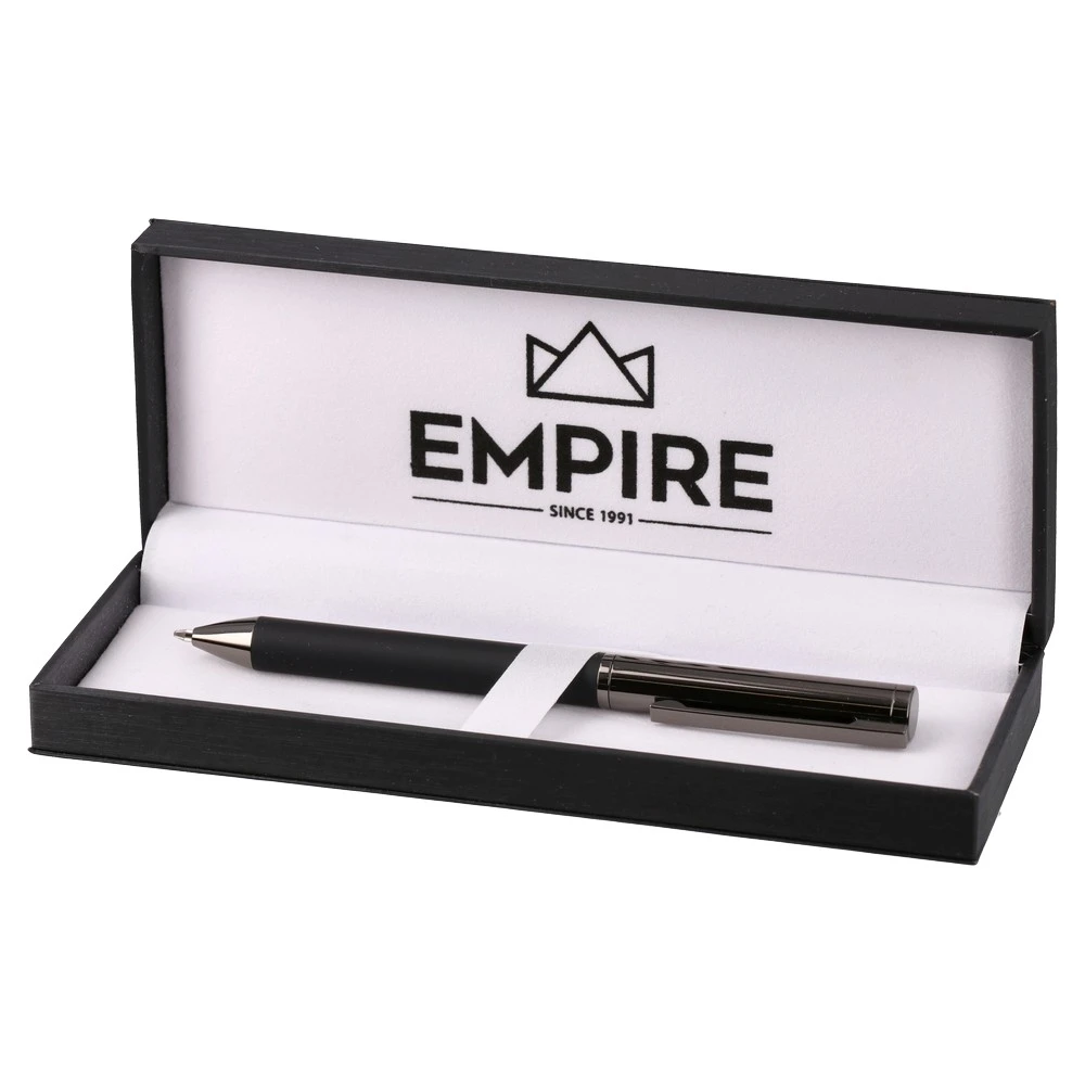 Felix ballpoint pen presented in a rigid gift box. Sleek matte barrel with polished metal clip and tip. Modern, minimalist design suited for corporate gifting and onboarding. Lined box with securing strap highlights quality and boosts perceived value at handover.