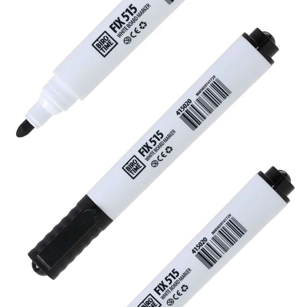 Fix 515 white board marker, black, features a minimalist white barrel with black cap and clip. Bullet tip delivers clear, uniform lines on whiteboards. CE marking and recycling symbol on body. Sturdy design and modern look suit meeting rooms, classrooms, and offices.