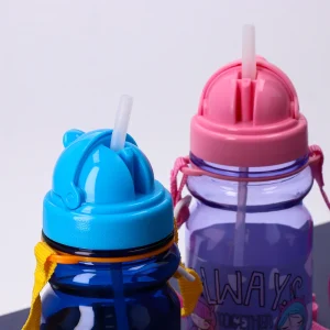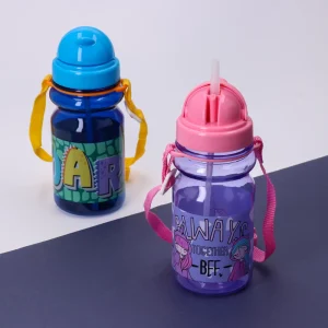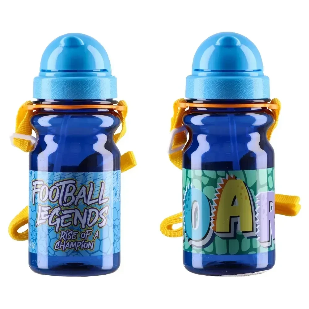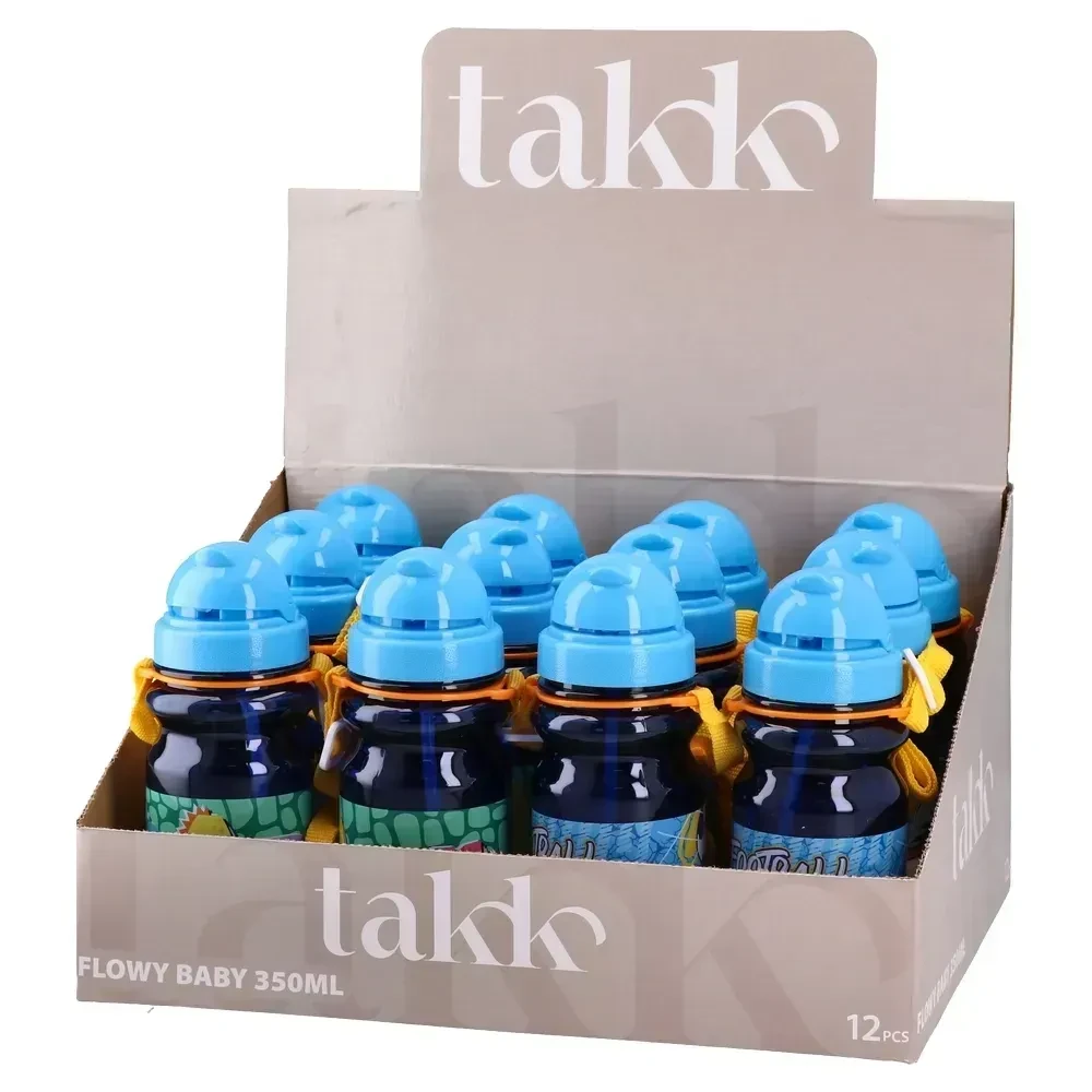 Flowy Baby bottle, 350 ml, durable plastic with deep blue body and bold boy-themed graphics. Sport and comic motifs drive appeal. Protective dome cap and carry strap for easy use on the go. Assorted designs enhance shelf impact and giftability, offering reliable quality for everyday hydration.