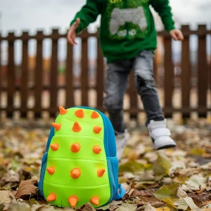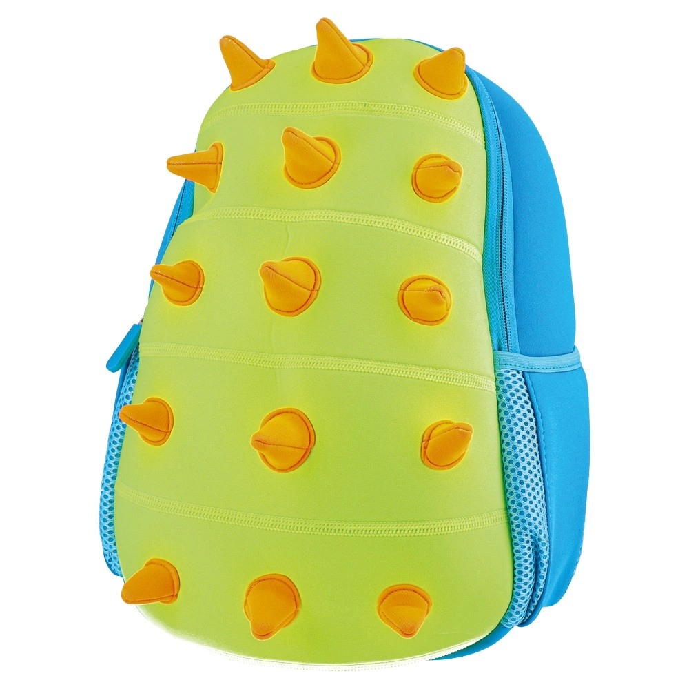 Foamy 10, backpack preschool, Dino barb features a bold 3D dinosaur shell with soft molded spikes, lime front and blue body. Zip closure and one side mesh pocket. Trend-forward color blocking and tactile surface drive shelf impact for preschool assortments.