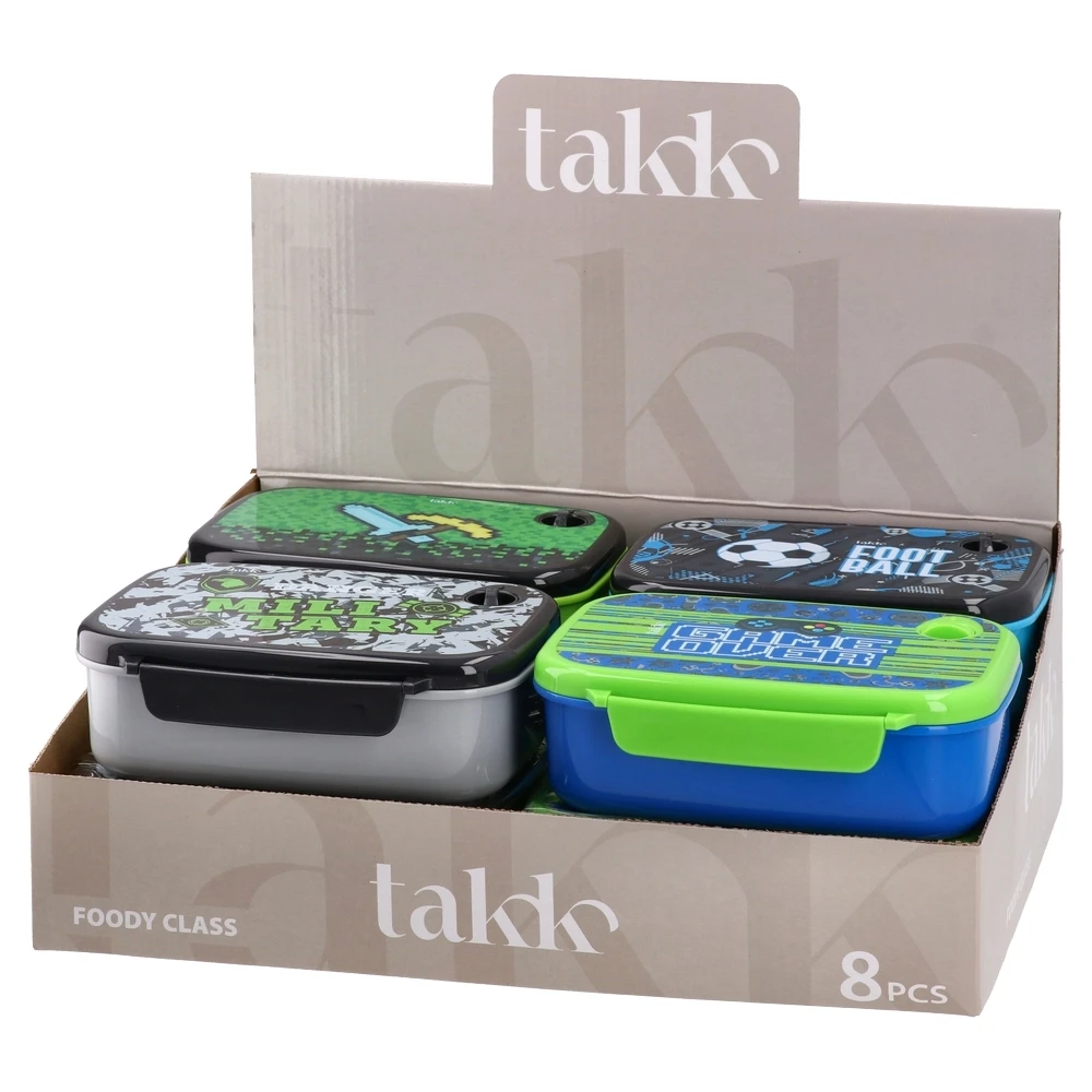 Foody Class lunch box, 765 ml. Durable plastic with printed lids in assorted boy-themed designs (football, gaming, military). Trendy colors and clean form factor enhance shelf impact and sell-through. Ideal size for school lunches and snacks. Mix of designs.