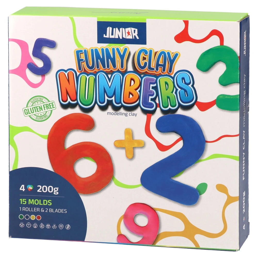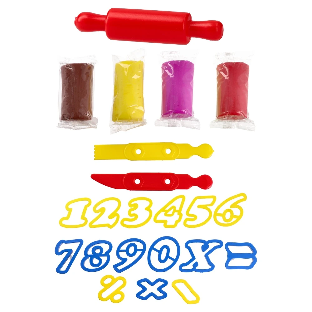 Gluten-free modelling clay set focused on numbers. Pack includes 15 molds plus 1 roller and 2 blades for shaping. Colorful, eye-catching packaging and trendy design enhance shelf appeal, offering a quality creative tool for forming digits and basic symbols.