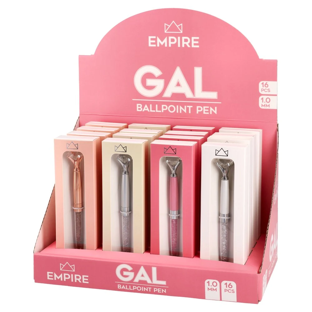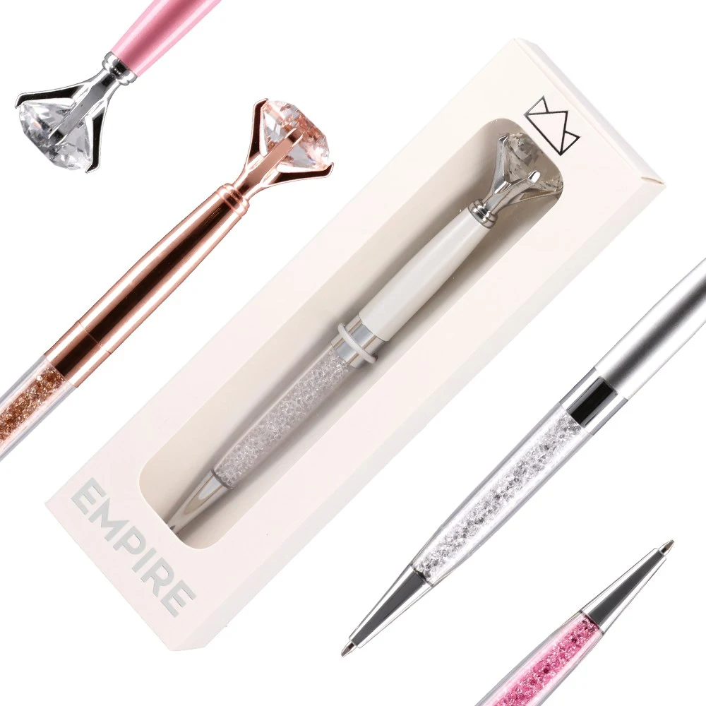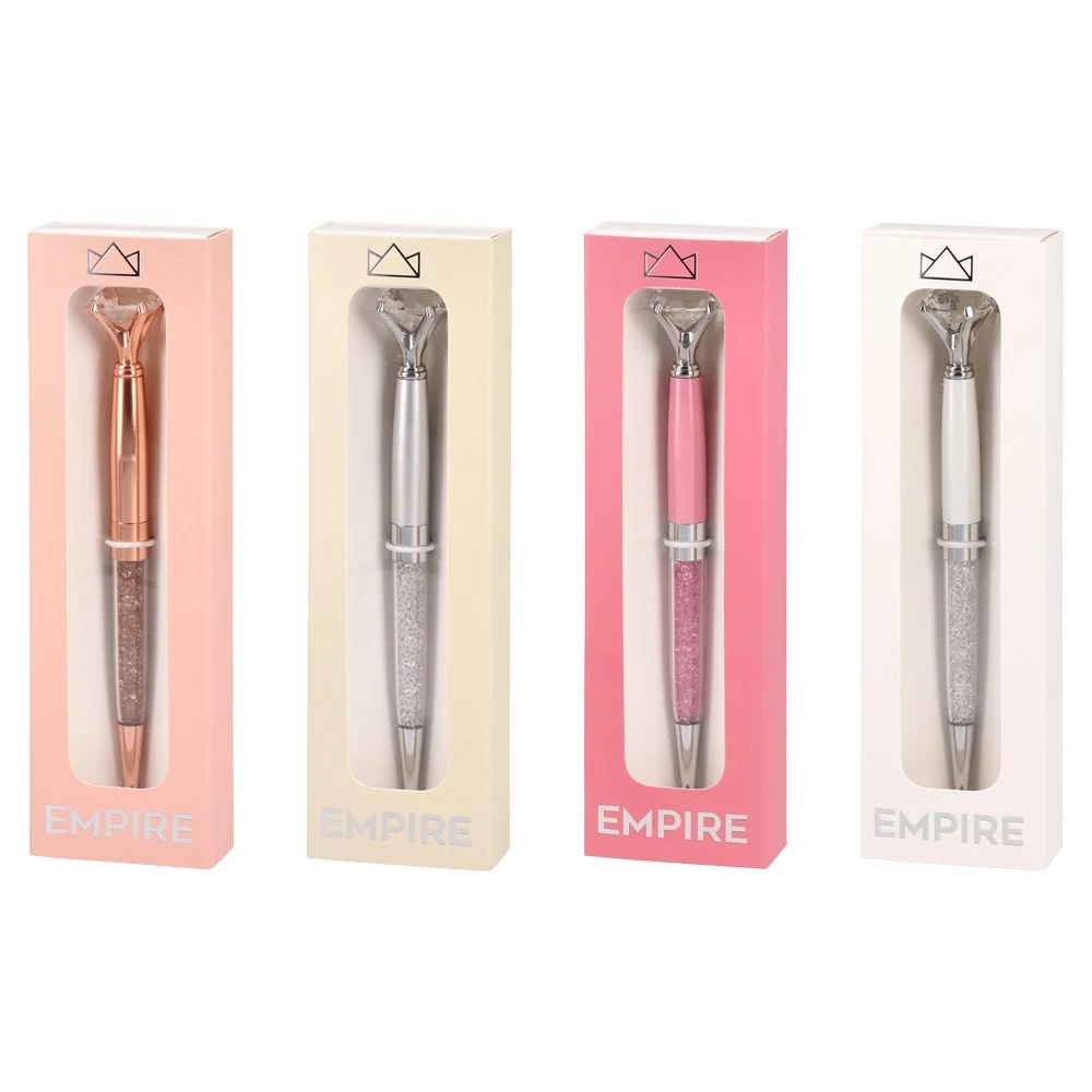 Trendy ballpoint with a diamond-style topper and glitter-crystal barrel, finished in sleek metallic tones. 1 mm tip with blue ink for smooth writing. Supplied in a presentation window box for premium shelf appeal and gifting—ideal for retail sets and corporate giveaways.