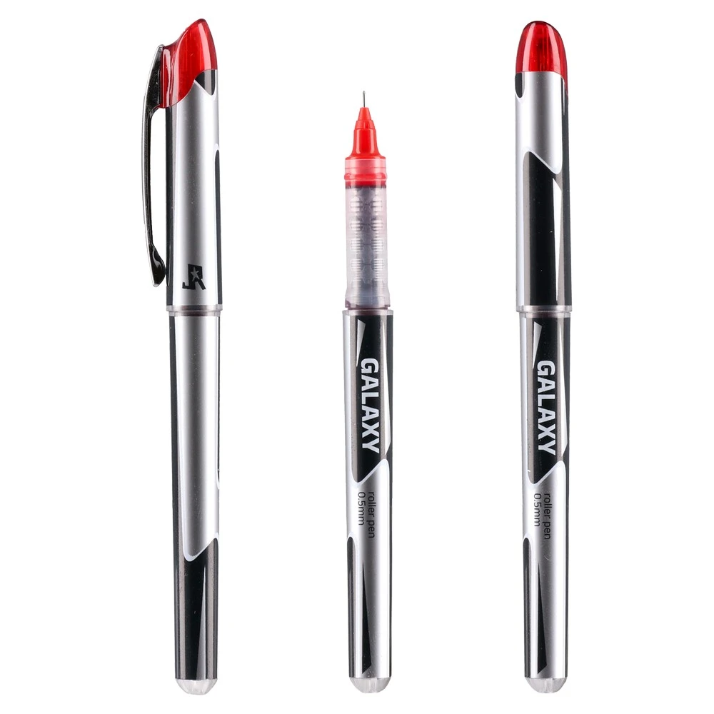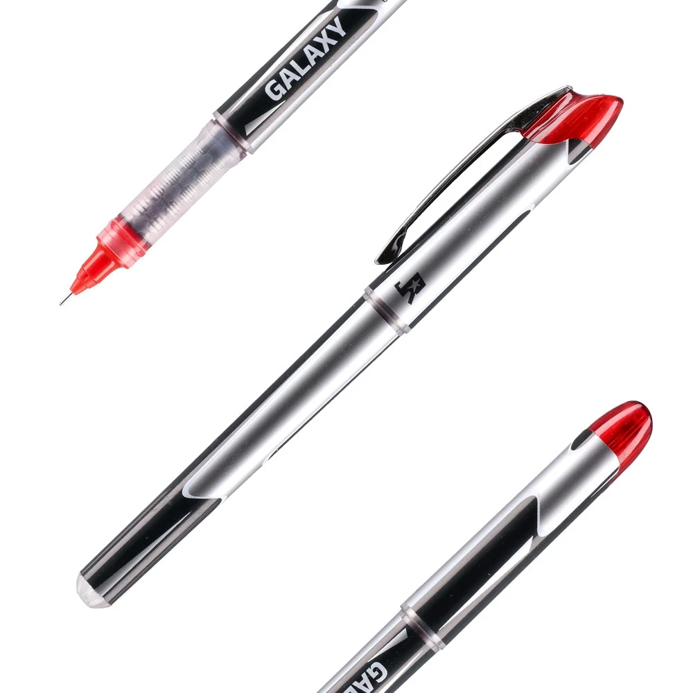 Galaxy gel pen, red, 0.5mm. Sleek silver barrel with modern graphic accents and a red cap. Fine needle tip for precise lines. Translucent ribbed grip enhances control. Secure cap with pocket clip. Consistent gel ink delivers vivid red marks for notes, edits, and clear annotations.