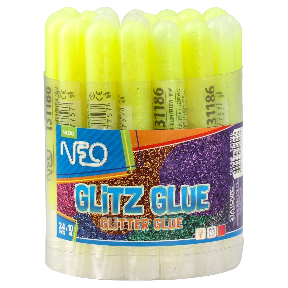 Glitz Glue, glitter glue, yellow neon, 10ml. Bright neon-yellow glitter in a sleek, rounded tube with a clear ribbed cap. The compact 10ml size is easy to handle and merchandise, delivering bold accents for cards, posters, and craft projects with a trendy, high-impact finish.