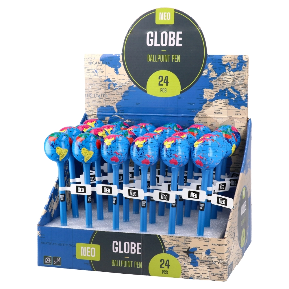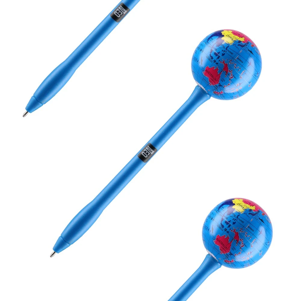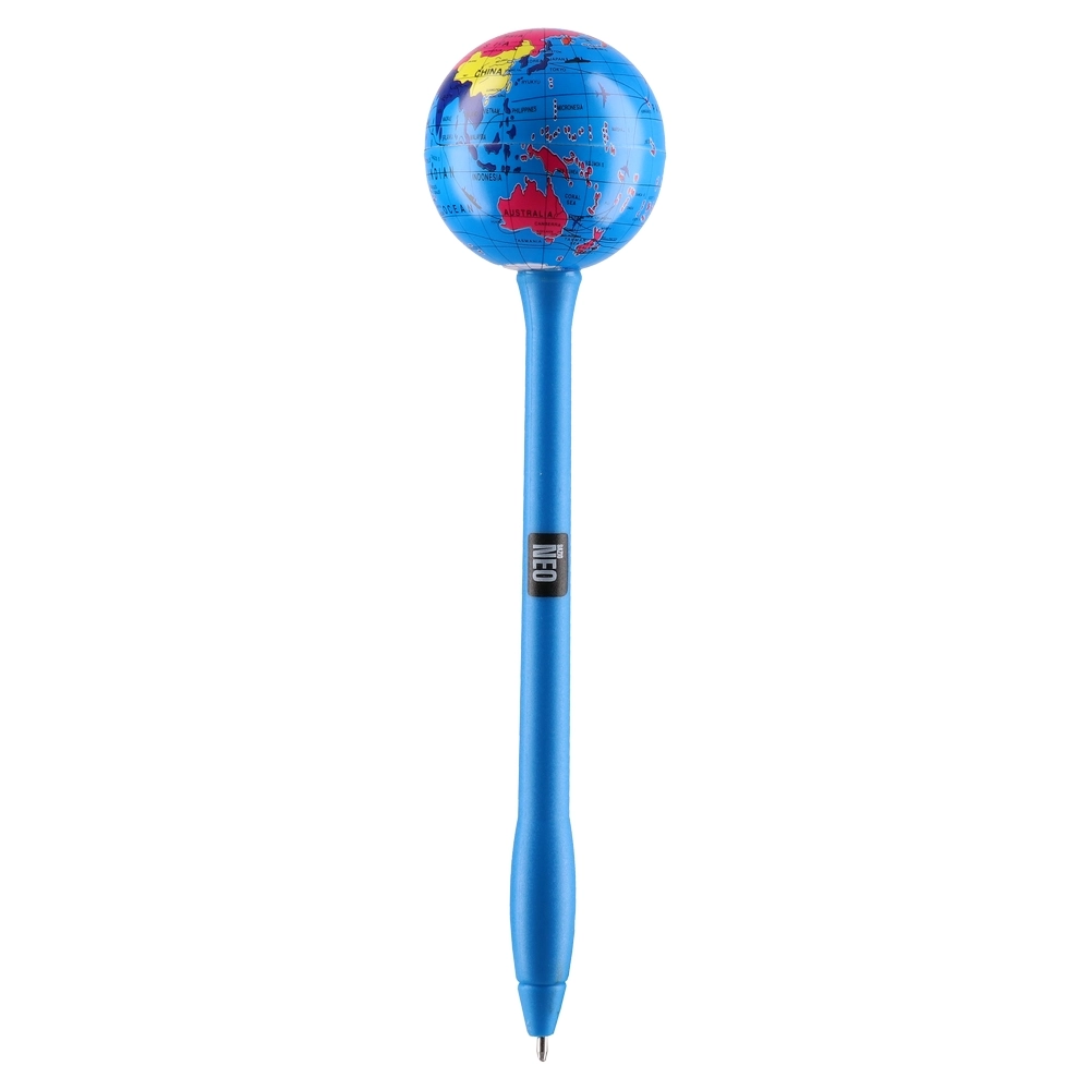 Eye-catching ballpoint with a vivid 3D globe topper and smooth matte blue barrel. The tapered body ends in a metal ballpoint tip for reliable everyday writing. A trendy desk accent and gift, well suited to travel or education-themed promotions and high-visibility merchandising.