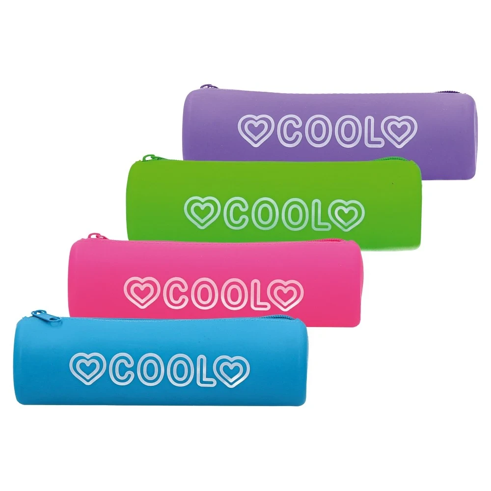 Goommy 10, pencil bag, mix: compact cylindrical zip pouch in vibrant assorted colors (purple, green, pink, blue) with bold “COOL” heart print. Smooth finish and a secure top zipper suit daily use. Trend-forward design ideal for school ranges, promotions, and impulse sales.