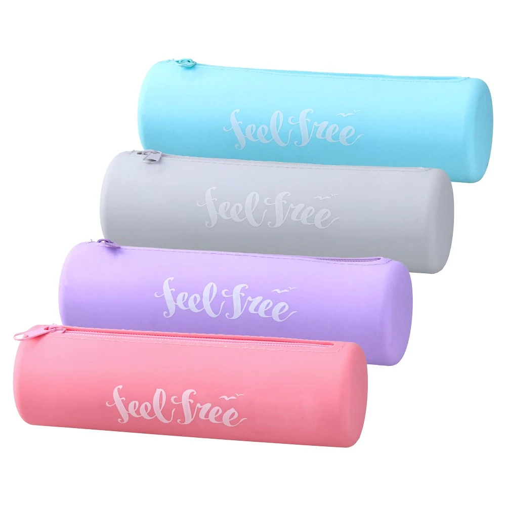 Goommy 140, pencil case, mix. Cylindrical zip case in assorted pastels (blue, grey, lilac, pink) with “feel free” print. Smooth matte finish, clean lines, and compact profile for easy carry and tidy storage. Eye‑catching, retail‑ready design for trend‑driven assortments.