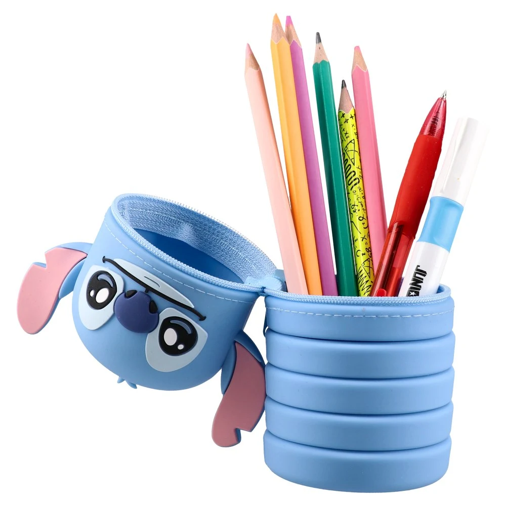 Goommy Stitch pencil cases with trendy 3D character tops and stand-up, telescopic bodies. Expand for desktop use, collapse for bags. Soft-touch flexible feel, secure zip closure, 3D ears, and top loop. Supplied in a blue/pink mix to boost shelf appeal and gifting. Durable finish for daily use.