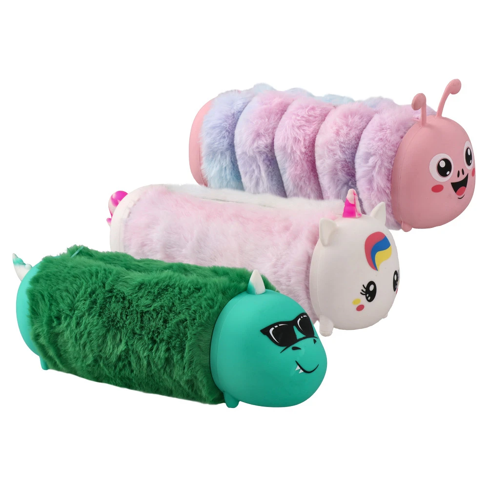 Goommy plush, pencil bag, mix. Trendy cylindrical cases with ultra-soft plush bodies and smooth character ends in unicorn, dinosaur, and caterpillar designs. Pastel and bold colors maximize shelf appeal. Mixed assortment encourages collectability and impulse sales for BTS and gifting.