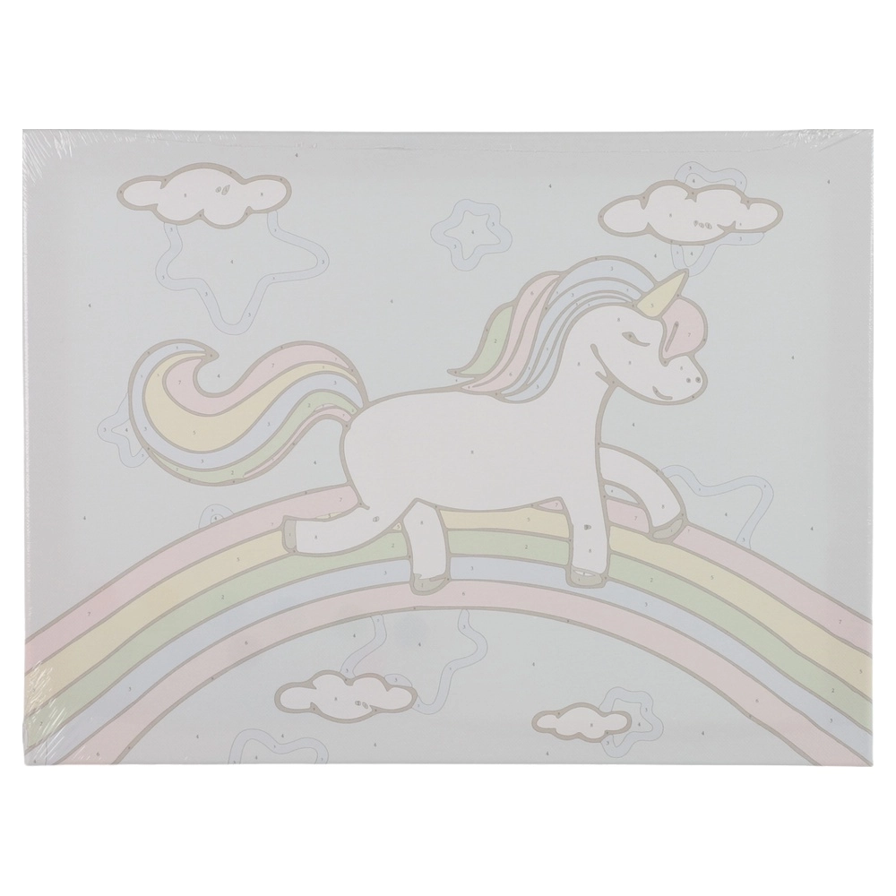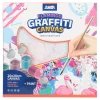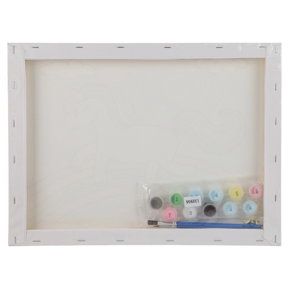 Unicorn graffiti canvas for creative art projects. White 30×40 cm canvas with pre-drawn sketch mounted on a blind frame for stable painting. Trendy design drives impulse sales and gifting. Includes paint. Ideal for creative assortments, workshops, and seasonal promotions.