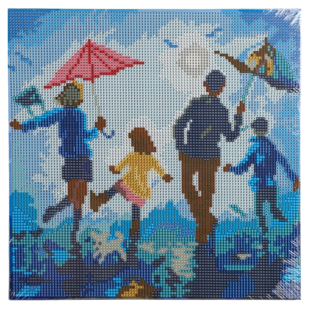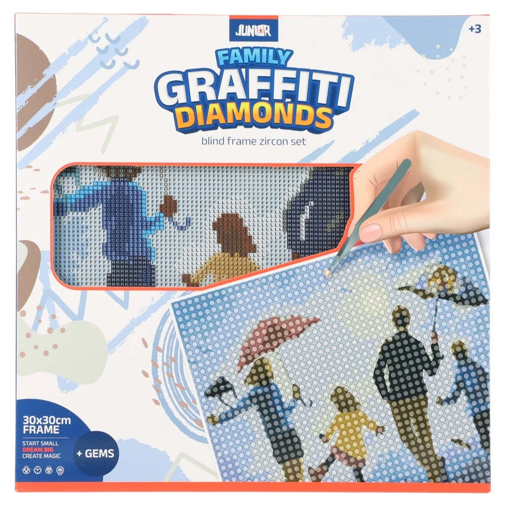 Trendy diamond-art kit with a 30x30cm white blind frame and dense pin grid for precise placement. Family motif with broad appeal. Includes zircon gems. Strong shelf impact and quick-turn craft sales potential, delivering crisp, sparkling results suitable for display or gifting.