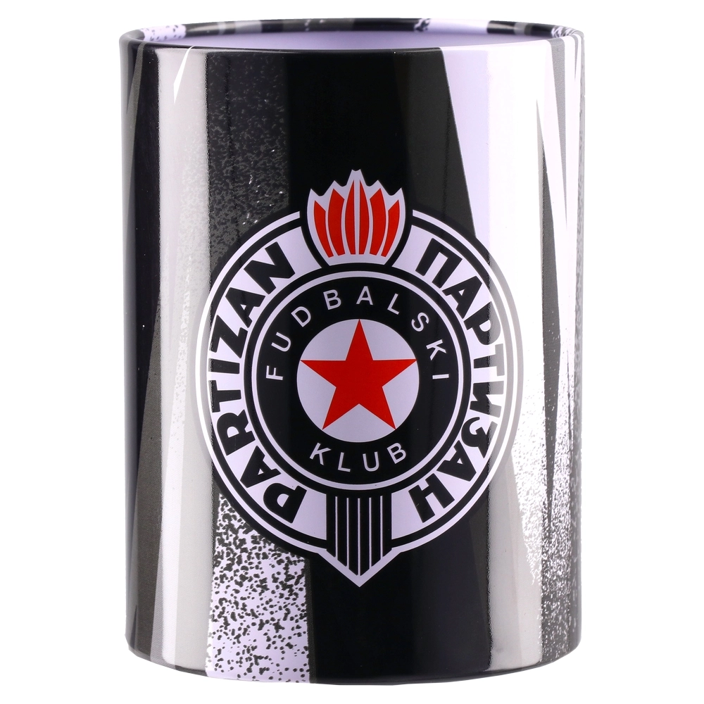 Holdy, pen holder, Partizan. Cylindrical desk organizer with a glossy black-and-white finish and the Partizan crest. Compact footprint and straight walls keep pens and tools upright while adding a bold, sporty accent to workspaces, retail displays, and fan-focused environments.