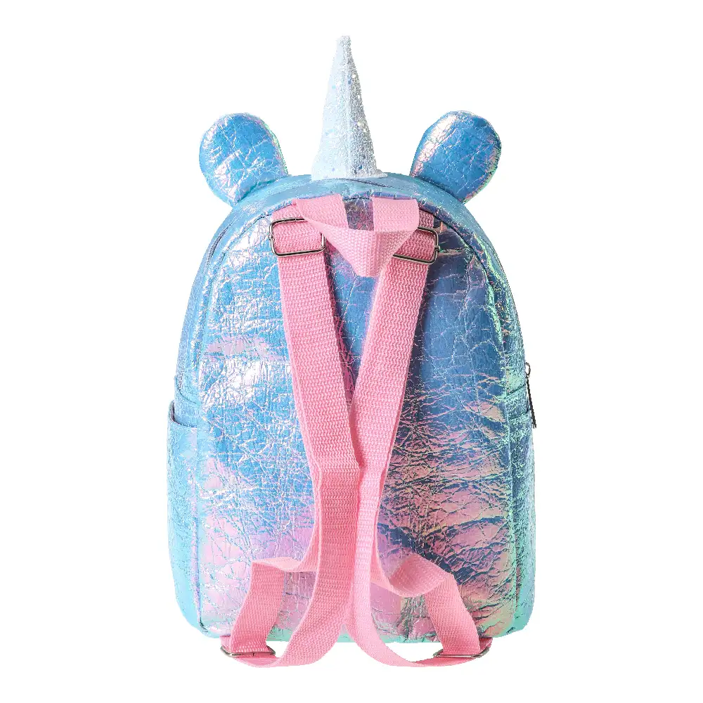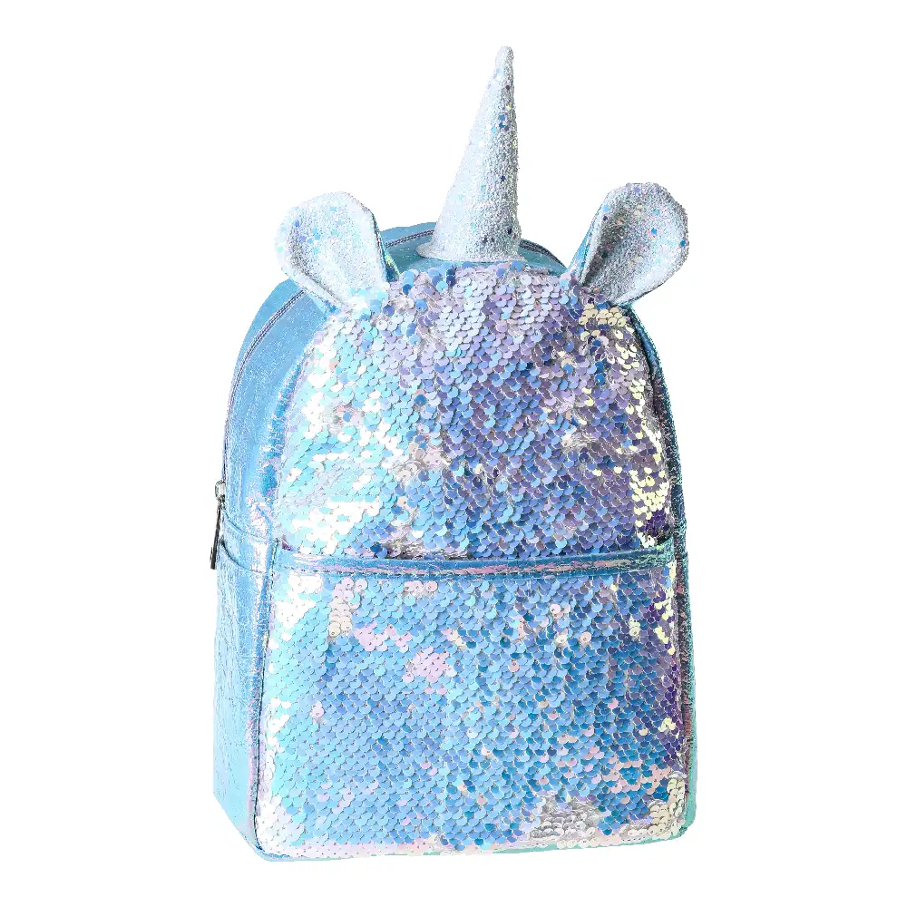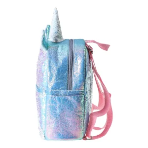 Holly 40 backpack by Sherd with an iridescent sequin finish and 3D unicorn horn and ears. Main zip compartment and front zip pocket for easy access. Trend-driven sparkle offers strong shelf impact and gifting appeal. Zip closures; ideal for kids fashion assortments.
