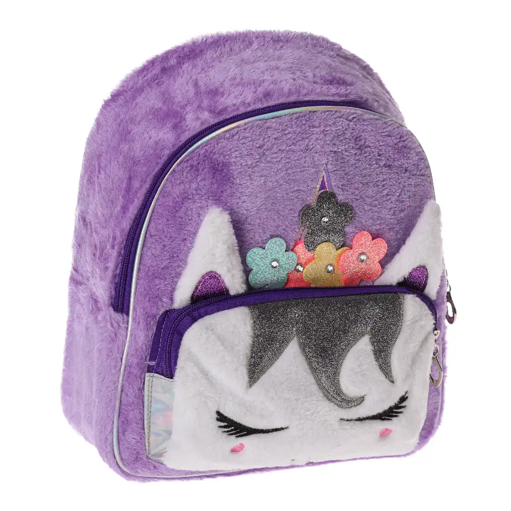 Holly 50, backpack, Unicorn. Trend-forward purple plush with a soft, tactile finish. Features 3D ears, glitter horn, mane and flower appliqués, plus an embroidered face. Main zip compartment and front zip pocket. High-impact aesthetic boosts shelf presence and gift/impulse appeal.