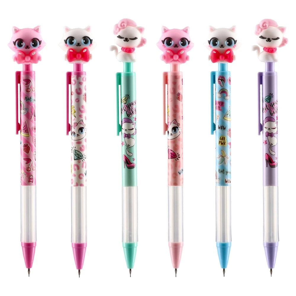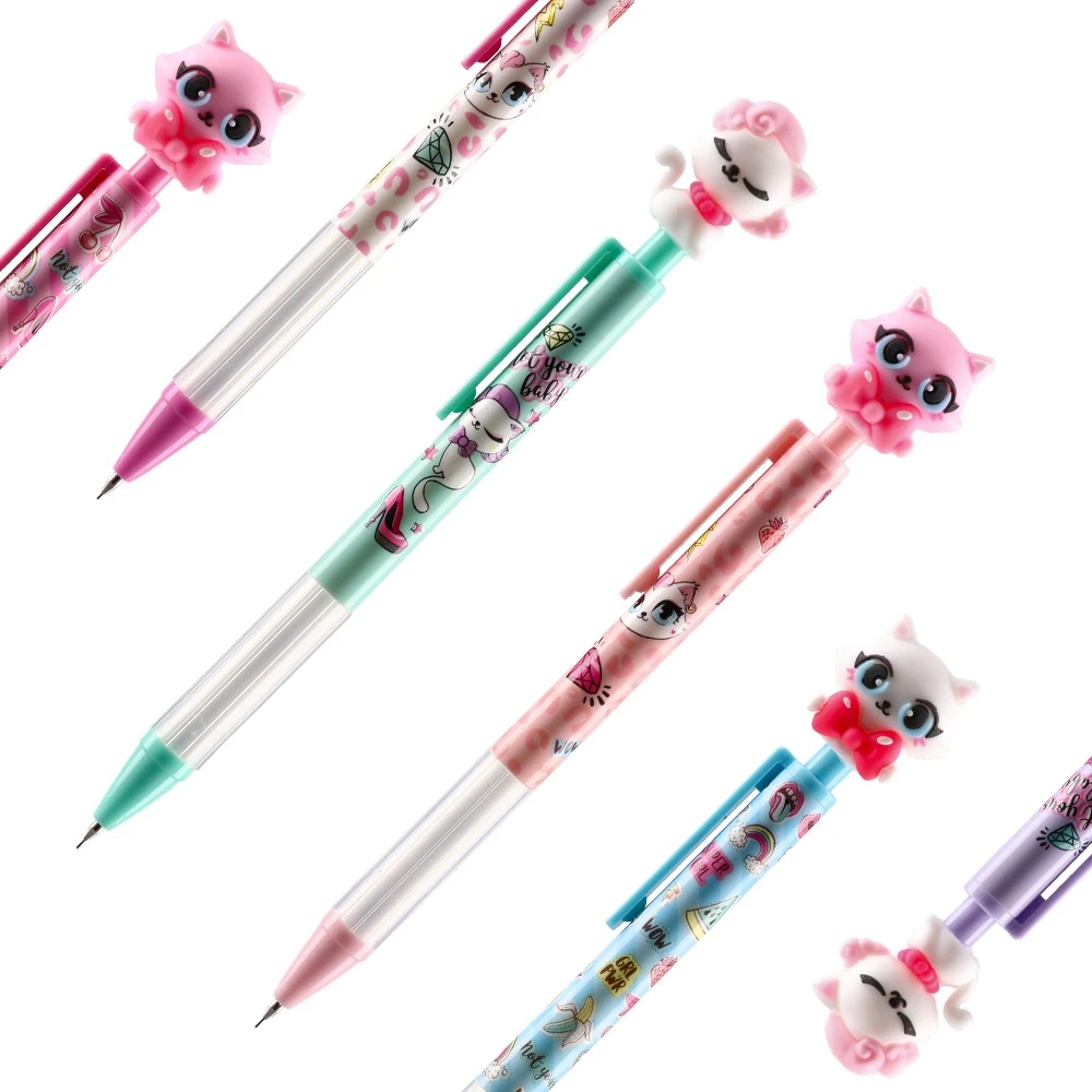 Hone mechanical pencil 0.5mm, Cats: pastel plastic barrels with cat-themed prints and matching clips, finished with a 3D cat topper for standout appeal. Fine 0.5mm line for neat notes and sketches. Trend-right design, assorted colors, strong impulse buy for stationery, gift and back-to-school ranges.