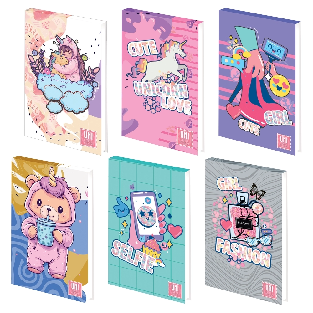 Compact 7 x 11 cm writing pad with assorted trendy covers—unicorn, selfie and fashion motifs in vibrant pastels. Flexible paper cover and practical format for everyday notes. Eye-catching graphics boost shelf and impulse appeal for school and gift retail. Uni branding; assorted designs.