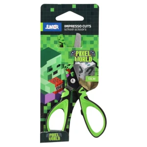 Impresso Cuts school scissors, 13 cm, in blister. Trendy pixel-world graphics and green handles add gamer appeal for school assortments. Metal blades support precise paper cutting, compact size fits pencil cases. Durable plastic handles and shelf-ready packaging.