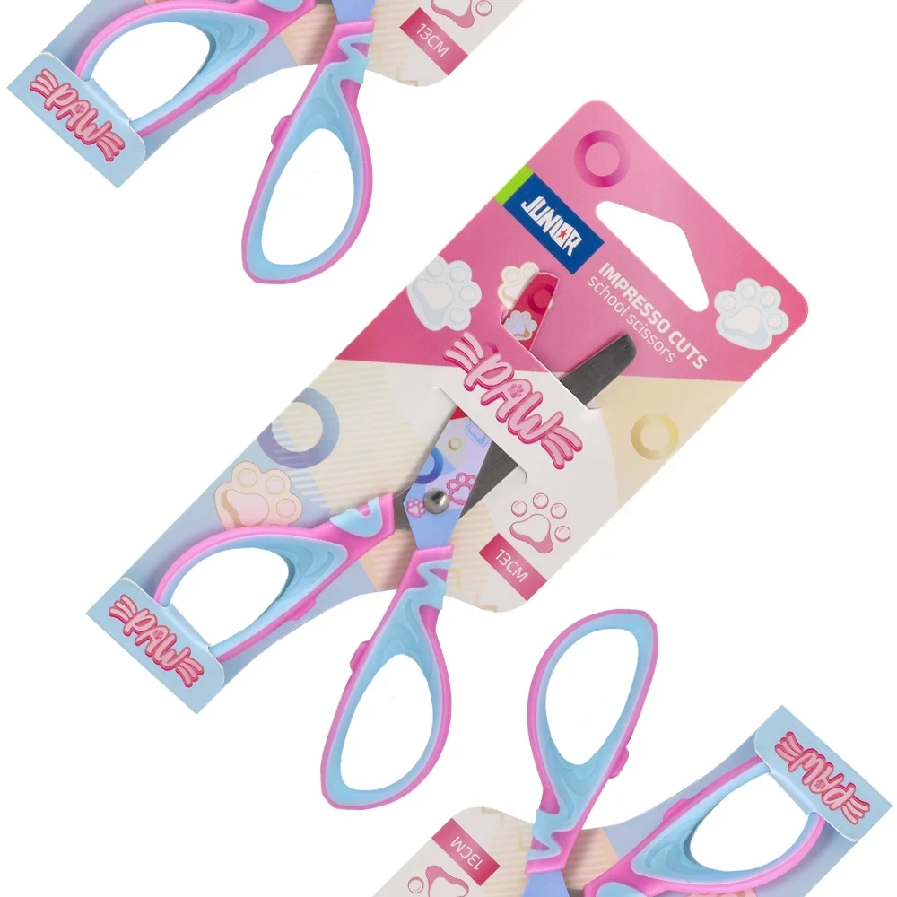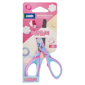 Impresso Cuts school scissors, 13 cm, in a paw-themed design. Trendy pink/blue palette with printed blades boosts shelf appeal for kids’ ranges. Metal blades and retail blister for easy display and merchandising. A strong fit for school stationery assortments.