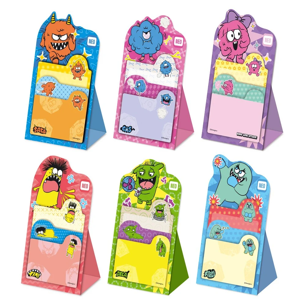 Indice 10, sticky notes, mix Strange. Colorful monster-themed adhesive paper notes and index tabs. Each pack contains 3 pads of 20 sheets in coordinated colors for quick marking and short messages. Trendy graphics and quality print enhance sell-through; assorted designs aid flexible merchandising.