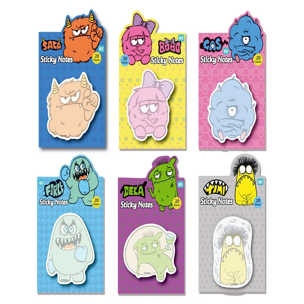 Indice 40 Strange sticky notes: mix of die-cut monster designs, each pad with 20 sheets. Bright, trend-led graphics boost shelf appeal and desk visibility. Quality paper with adhesive backing for quick notes and reminders. Ideal for school, office, gifting and impulse sales.