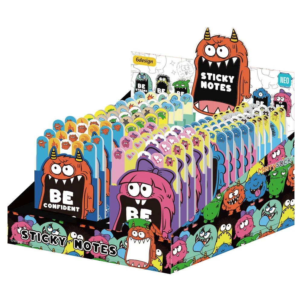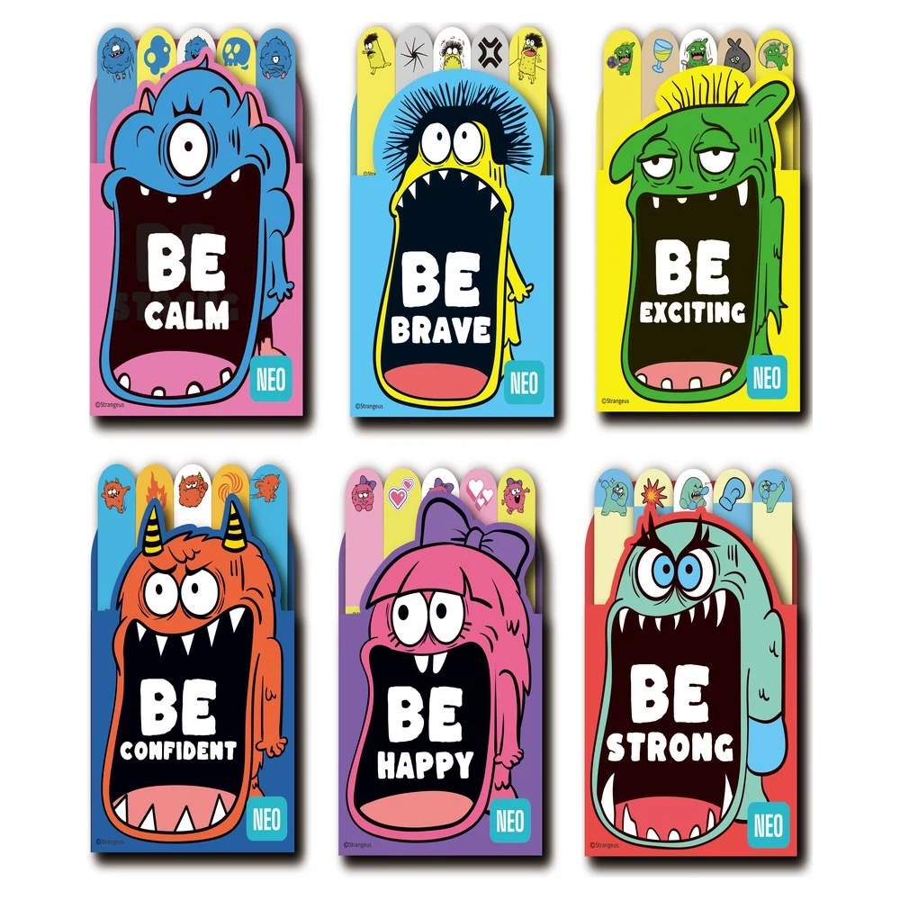 Indice 50 sticky notes, 6 x 20 sheets, mix, Strange. Six pads of paper index tabs with vivid monster graphics and slogans: Be Calm, Be Brave, Be Exciting, Be Confident, Be Happy, Be Strong. Adhesive tabs mark pages cleanly and boost shelf appeal for school, office, and gifting.