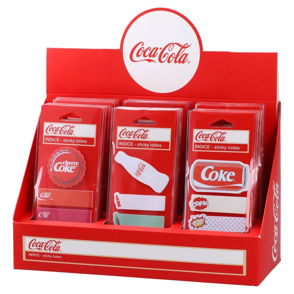 Indice sticky notes set with Coca‑Cola design. Five index pads, 20 sheets each, in assorted red and pastel themes with bottle, can and pop‑art motifs. Quality adhesive paper for quick flags and notes. Trend-led branding boosts visibility and shelf appeal for office, study, and merchandising.