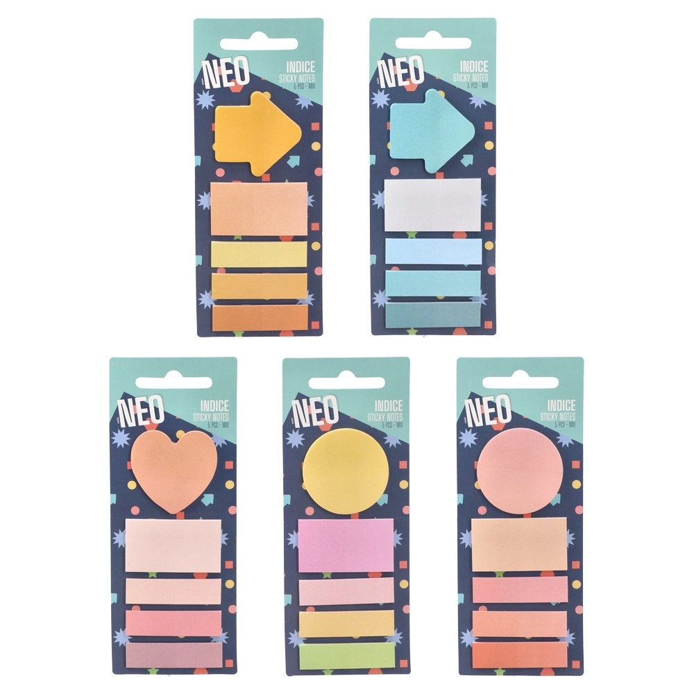 Indice sticky notes for modern workspaces. Pack includes 5 mixed-shape pads—arrow, heart, circle and slim page flags—in soft pastel tones. 20 sheets. Quality adhesive paper for quick placement on files, planners and books. Great for indexing, color-coding and concise reminders.