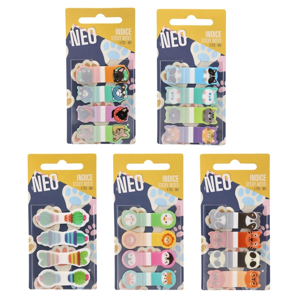 Indice sticky notes for quick indexing. 15×44 mm tabs. Pack of 4 pads, 20 sheets each, in mixed pastel animal designs. Trend-led look boosts visibility in planners, books, and files. Supplied in retail-ready hanging card for easy display and fast sell-through.