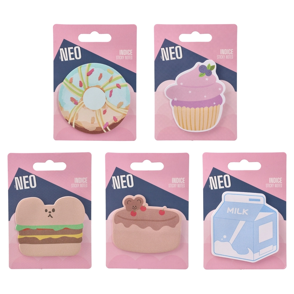 Indice sticky notes, 68×68 mm, 20 sheets per pad. Mix of food-themed shapes—donut, cupcake, burger, cake, milk carton—adds a trendy pop to planners and desks. Vivid printed paper with adhesive backing for quick notes and indexing. Strong shelf appeal for retail assortments.