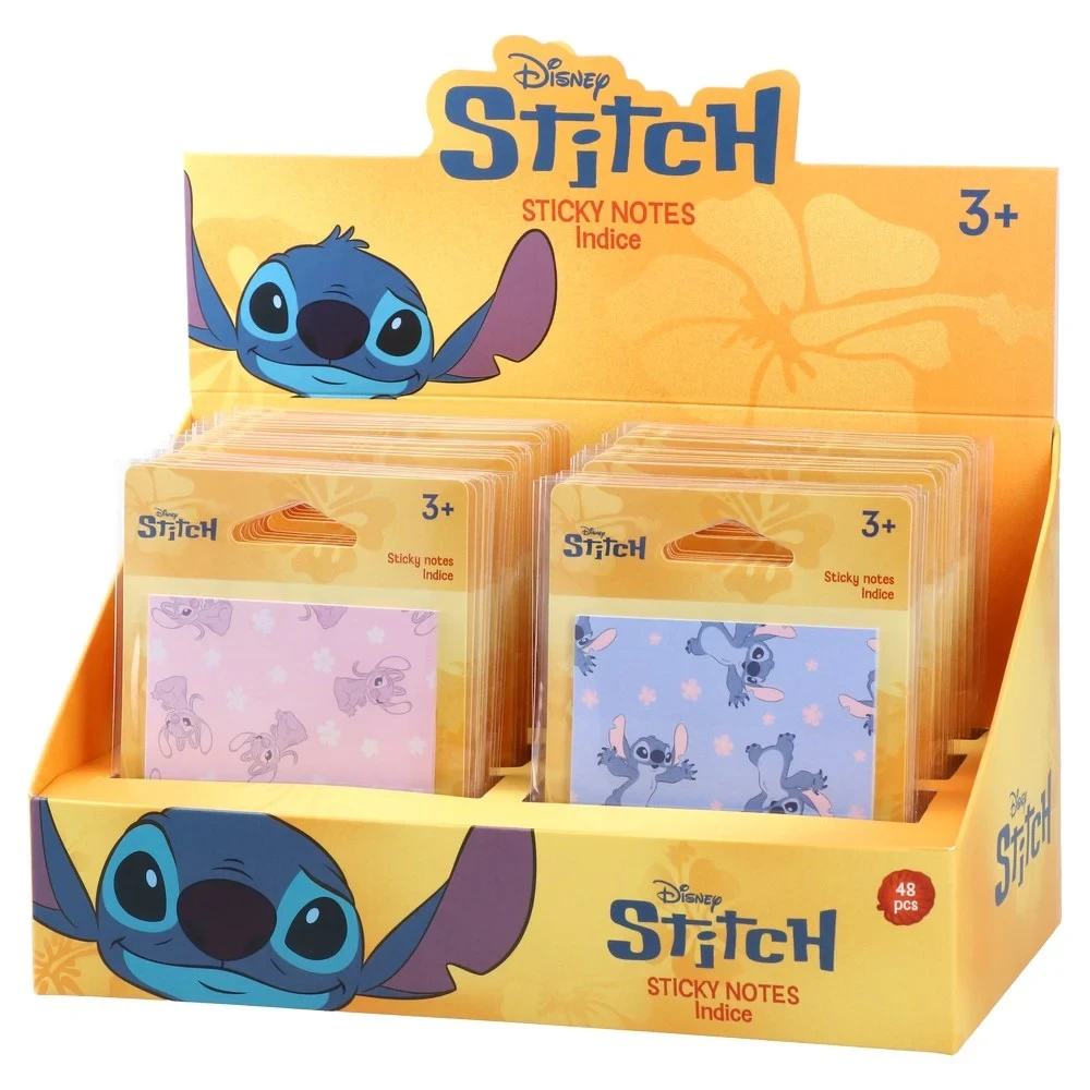 Indice Sticky Notes, 68x68mm, 20 sheets. Square paper pad with Disney Stitch-themed prints in pastel tones. Self-adhesive for easy indexing and quick notes. Trend-forward design enhances desktop visibility and shelf appeal for education and office assortments.
