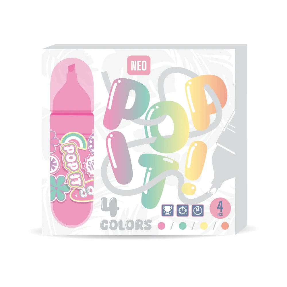 Ivy, highlighter, chisel tip, mix, 4pcs. Trend-forward packaging and playful graphics boost shelf appeal. Assorted bright inks (pink, green, yellow, orange). Versatile chisel tip produces broad strokes or precise underlines. 4 pcs per pack for efficient stocking.