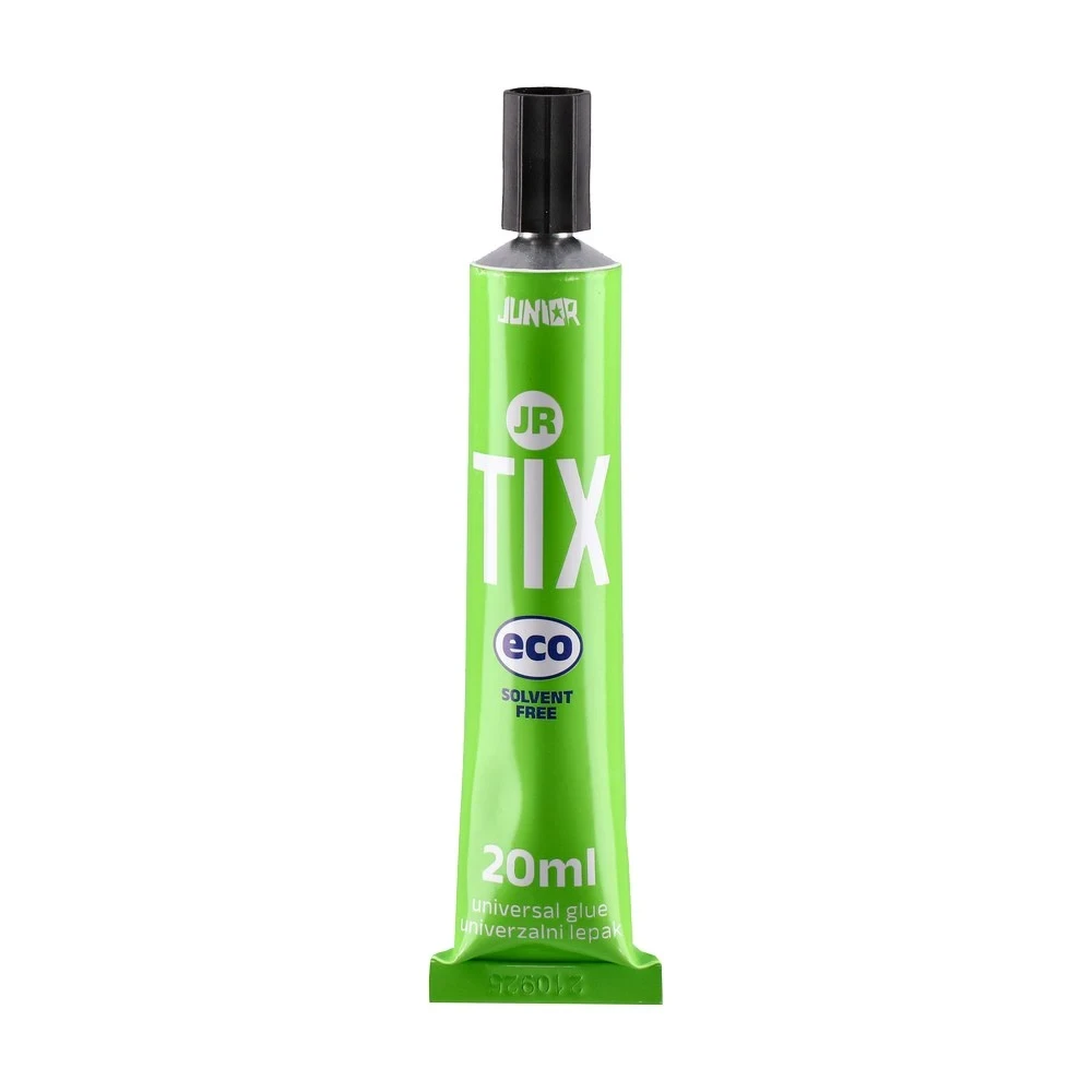 Jr Tix, water-based glue, 20ml. Universal adhesive in a modern, eco-branded squeeze tube with screw cap. Quick stick and tight hold for routine bonding. Vibrant green graphics deliver shelf impact, while the display-ready box simplifies merchandising and boosts sell-through.