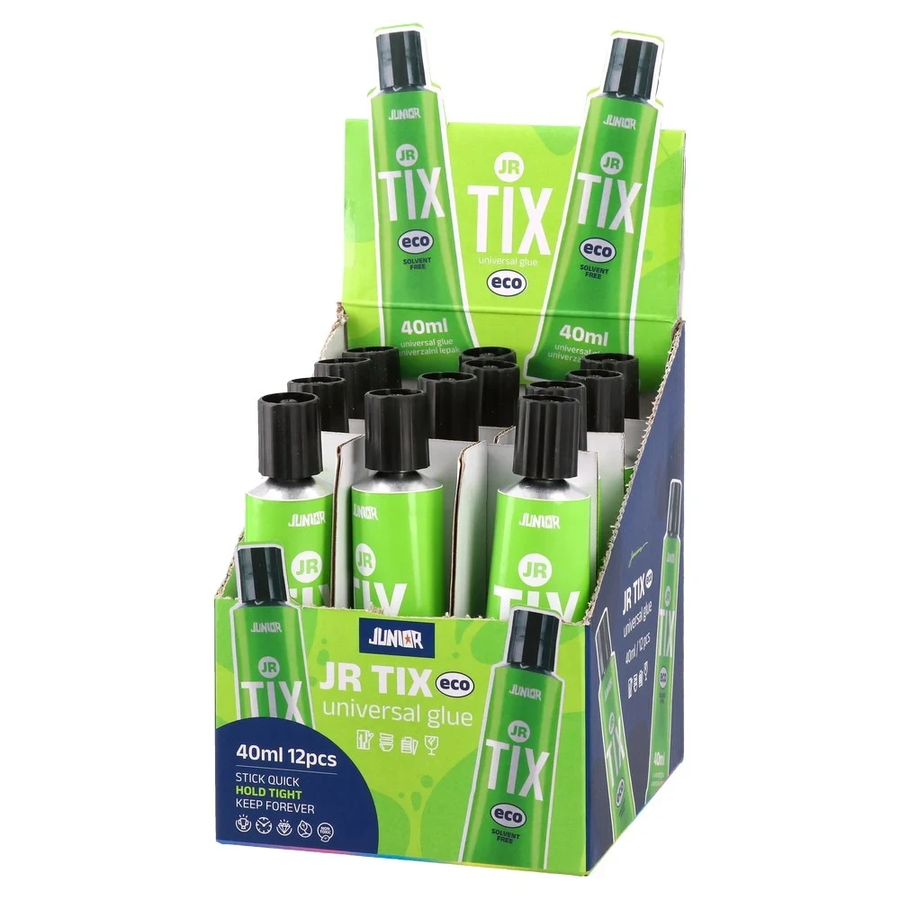 Jr Tix, water-based glue, 40ml. Eco, solvent-free universal adhesive in an on-trend green squeeze tube with black cap. Quick stick and tight hold (as stated on pack). Compact 40ml format. Supplied in a shelf-ready display of 12 pieces for efficient merchandising.