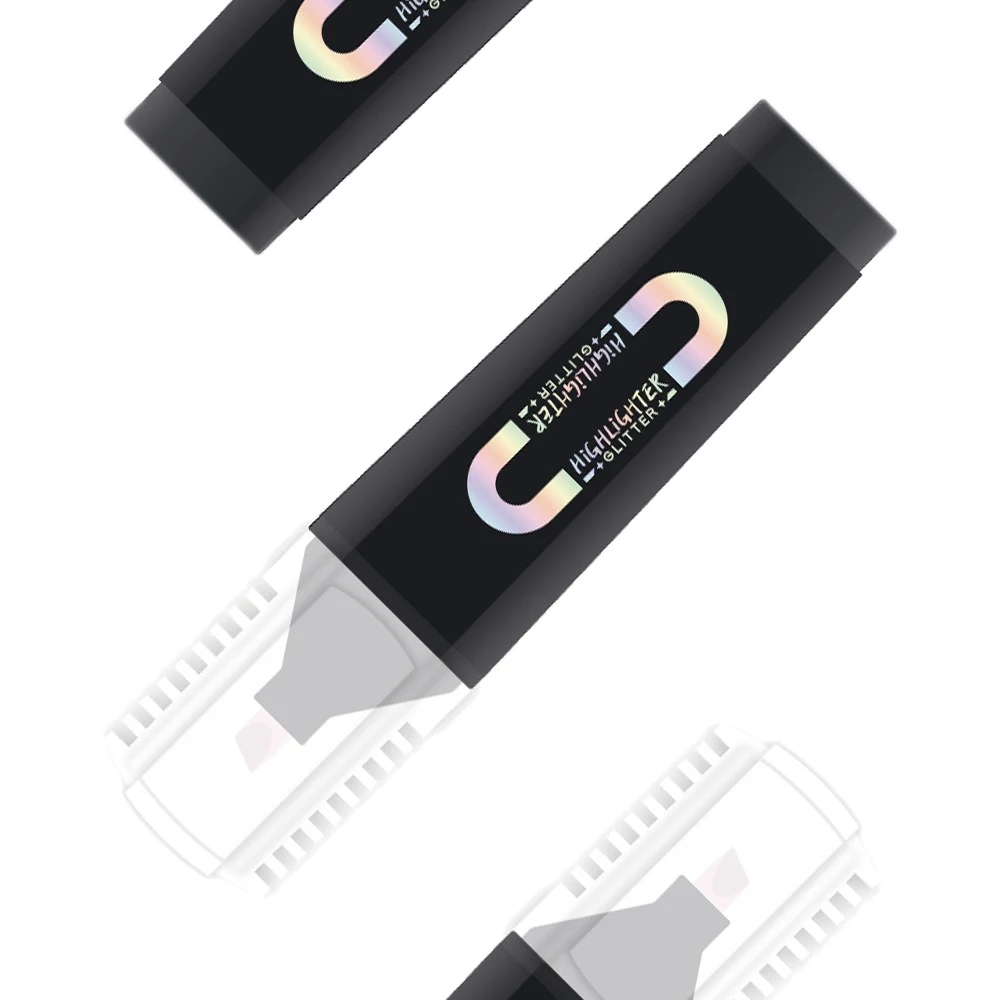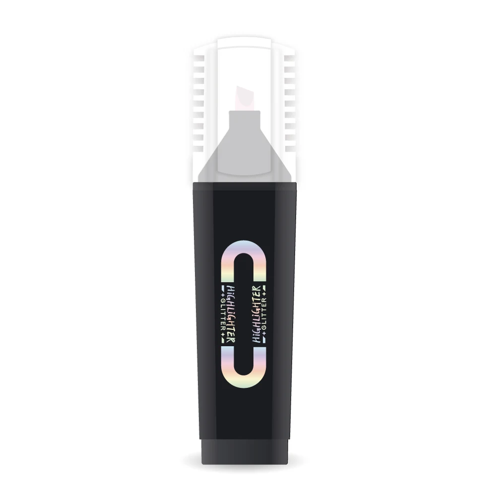 Kaito glitter highlighter in neon with a chisel tip for broad strokes and fine edges. Sleek black plastic body with holographic detail and a clear protective cap create a modern look. Sparkling output and trend-forward design offer strong shelf appeal for stationery assortments.